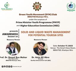 Solid And Liquid Waste Management For Potential Tourism SitesGreen Youth Movement (GYM) Club, BBSUTSD, Khairpur Mirs, under the auspices of Prime Minister Green Youth Movement (PMGYM) and Higher Education Commission (HEC) presents awareness session on "SOLID AND LIQUID WASTE MANAGEMENT FOR POTENTIAL TOURISM SITES" check event