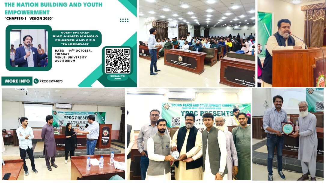 The Benazir Bhutto Shaheed University of Technology and Skill Development (BBSU- Tech), Khairpur Mirs, successfully organized “Nation Building and Youth Empowerment – Chapter 1: Vision 2050” to inspire students toward leadership, policy-making, and active participation in national development. The program began with a welcome note by YPDC President Tahseen Javed, emphasizing the role of youth in shaping Pakistan’s future. Mr. Riaz Ahmed Manglo conducted a special session on “Leadership and Management,” sharing insights on essential leadership and decision- making skills. Following this, interactive youth activities included policy-making presentations and a Youth Parliament round-table, where students shared innovative ideas and discussed solutions for national challenges under Vision 2050. Engr. Abdul Shakoor Shaikh, Student Welfare Officer, appreciated YPDC’s efforts in fostering civic responsibility. Vice Chancellor Prof. Dr. Rasool Bux Mahar commended the organizers and participants, stressing that empowered and educated youth are the architects of Pakistan’s sustainable future. He encouraged continued participation in initiatives promoting peace and innovation. The successful and inspiring event concluded with an award distribution ceremony, a group photo, and refreshments.