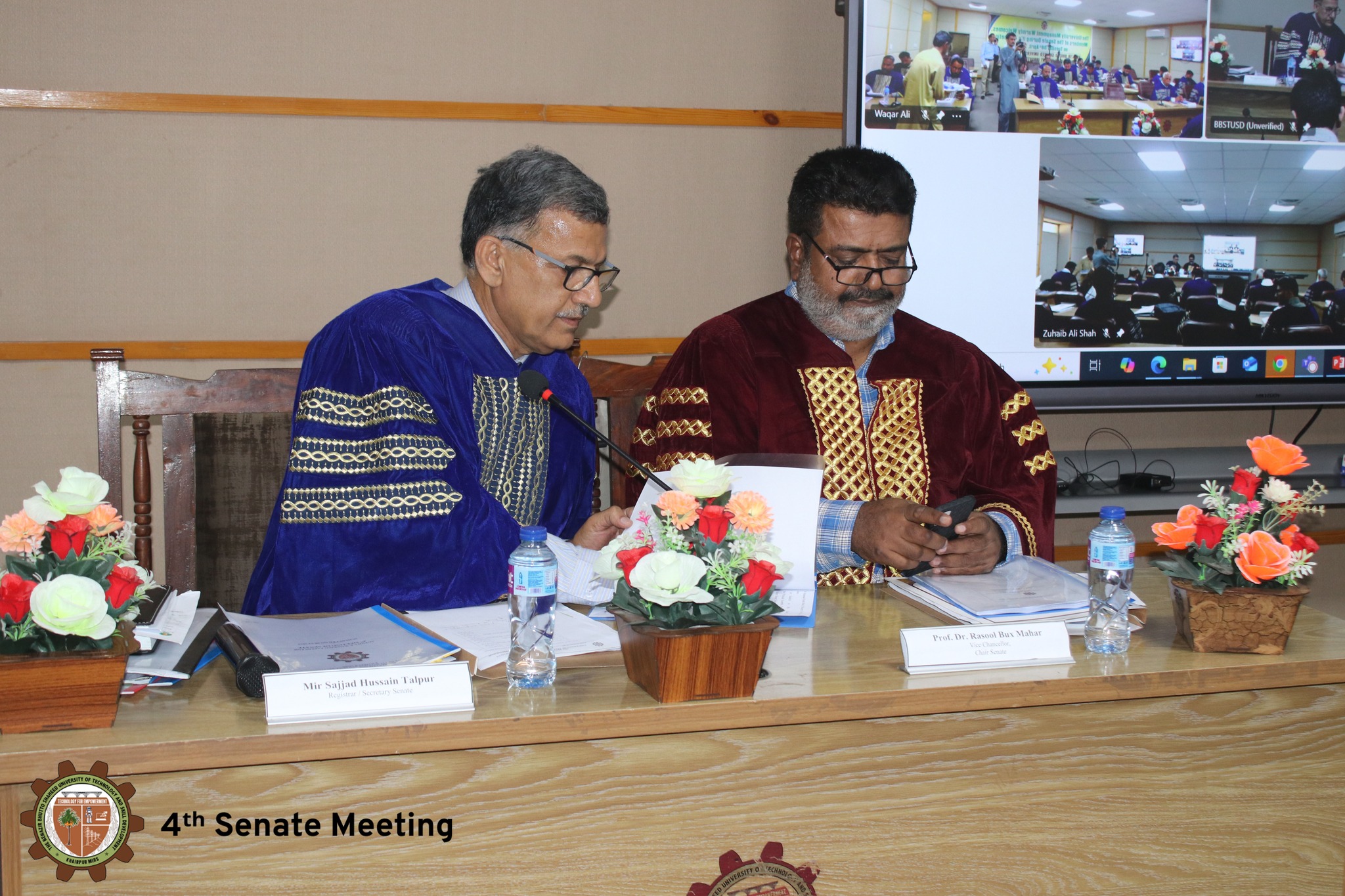4th meeting of the Senate of Benazir Bhutto Shaheed University of Technology and Skill Development Khairpur Mirs chaired by the Vice Chancellor, Prof. Dr. Rasool Bux Mahar, was held on Tuesday, 08.04.2025. Senate after detailed discussion, approved the actual expenditures for fiscal year 2023-24 and budget estimates for the fiscal year 2024-25, approved the Annual Report of the University for the year 2024, and took several strategic decisions on administrative and financial matters.