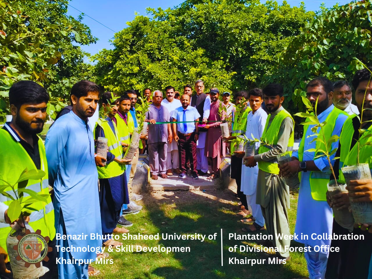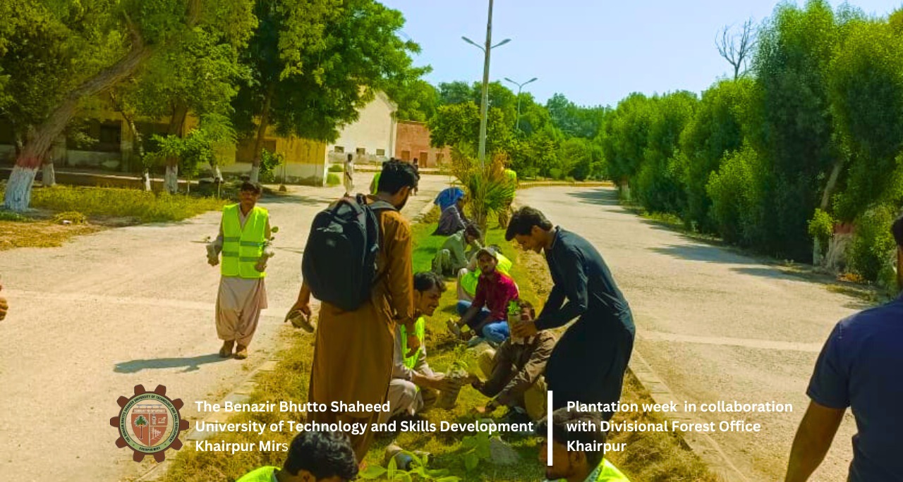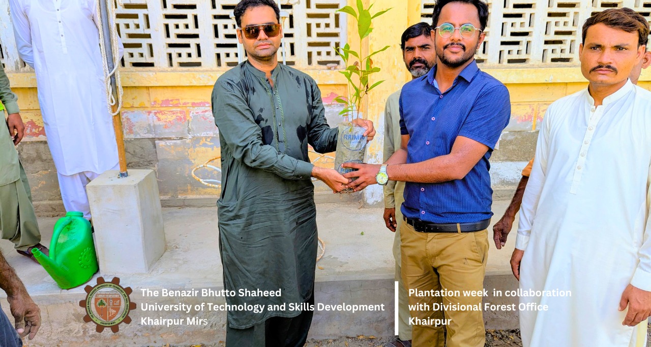Khairpur, September 25, 2024 – Benazir Bhutto Shaheed University of Technology and Skill Development (BBSUTSD) Khairpur proudly inaugurated Plantation Week today, with great enthusiasm and participation from faculty, staff, students, and various departments. The event, organized by the SDG Section, GYM Club, and the Sports Section, marks the beginning of a week-long drive aimed at promoting environmental sustainability and enhancing the greenery on campus.